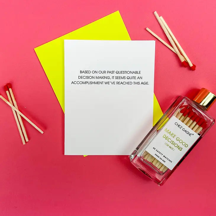 Our Questionable Decision Making card is letterpress printed on a vintage printing press. Paper: Bright White, Tree-Free 100% Cotton Paper Ink: Black Envelope: Yellow Size: 4.25" x 5.5" Folded card, blank inside Sealed in a cello sleeve