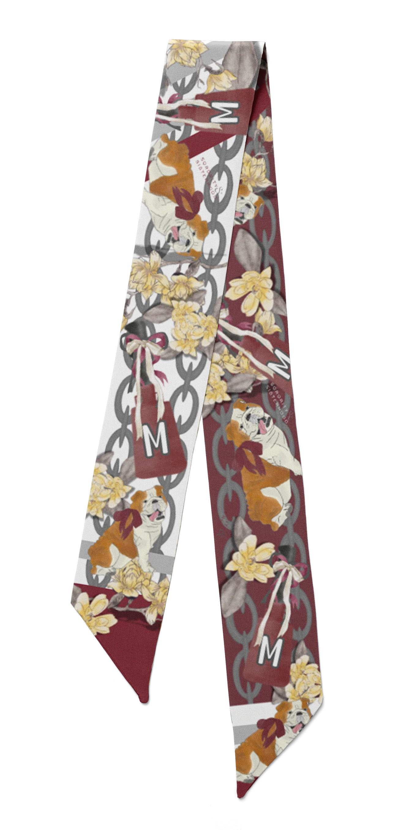Show your Bulldogs pride with our premium Mississippi State University scarflette, an accessory as versatile as it is elegant. Crafted from luxurious silk with Mississippi State's iconic maroon and white color palette, this thoughtfully designed piece features delicate floral patterns, chain-link motifs, and bulldog designs that celebrate the spirit and tradition of Starkville.