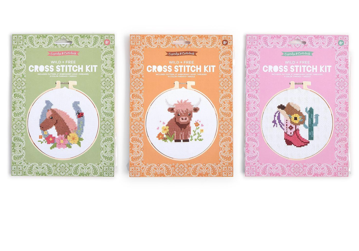 - Craft kit includes pattern, hoop, threads, needle, and threader