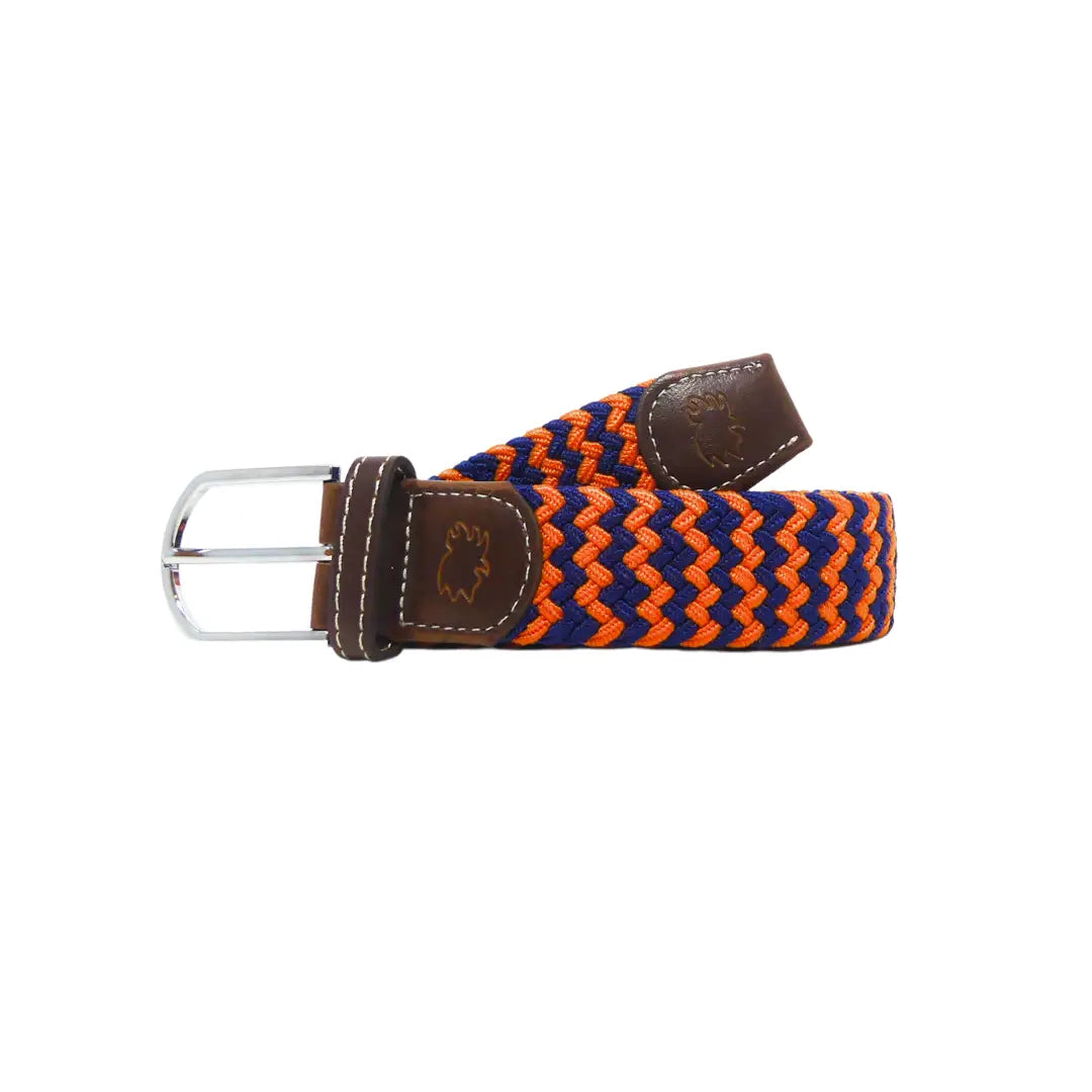 The Dothan two-color woven elastic-stretch belt. Navy & Orange belt with a rounded buckle and dark brown leather finish stamped with the Roostas logo. An adjustable clasp goes through the woven belt, allowing for adaptable sizing. Designed for comfort both on and off the course.