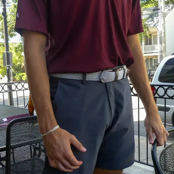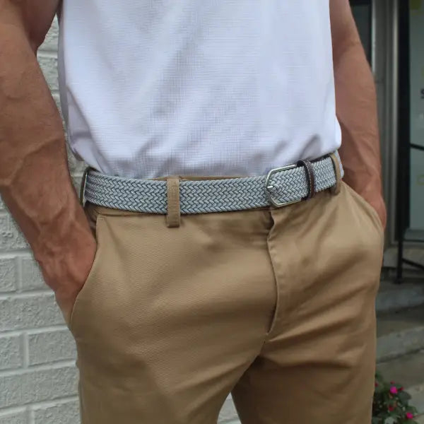 The Kohler two-toned woven stretch belt. Gray and White Belt with a rounded buckle and dark brown leather finish stamped with the Roostas logo. An adjustable clasp goes through the woven belt, allowing for adaptable sizing. Designed for comfort both on and off the course.